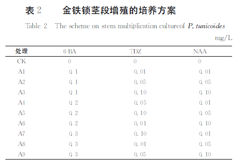 待誘導出的生長(cháng)健壯的腋芽長(cháng)至4-125px,將其截為1-2cm帶有葉腋的莖段,平鋪于增殖培養基上進(jìn)行增殖培養。增殖培養時(shí),在基本培養基中添加不同配比的外源激素組合并設空白對照(CK),共計10個(gè)處理,每處理接種5瓶,每瓶接種4枚,30d后統計平均增殖系數、平均苗高及幼苗的生長(cháng)情況, 很終篩選出適宜的金鐵鎖莖段增殖培養的較優(yōu)條件。增殖培養時(shí)不同外源激素組合方案如表2所示。