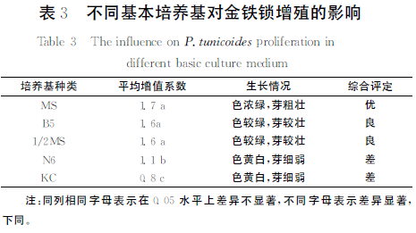 金鐵鎖幼嫩帶葉腋的莖段經(jīng)消毒后,接種于不同的基本培養基中。由表3可以看出,經(jīng)30d的培養,增殖倍數可達0.8-1.7倍,MS培養基不定芽增殖系數 很高為1.7,KC培養基不定芽增殖系數 很低為0.8,說(shuō)明不同類(lèi)型的基本培養基對金鐵鎖莖段培養有明顯影響。方差分析表明,在MS、B5和1/2MS培養基中,金鐵鎖莖段的平均增殖系數之間無(wú)顯著(zhù)差異,說(shuō)明在這3種基本培養基中,均可獲得較好的培養效果。但是,MS培養基中生長(cháng)的芽苗長(cháng)勢粗壯、濃綠,生長(cháng)效果明顯優(yōu)于B5和1/2MS培養基,因此認為,MS培養基適合作為金鐵鎖莖段培養的基本培養基。